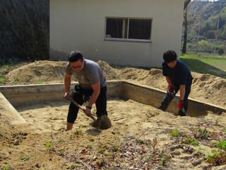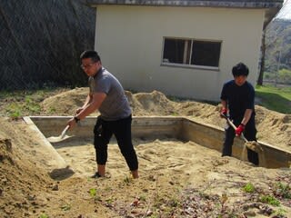 グラウンドにある砂場だった場所の砂を出す作業をしています
