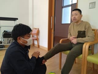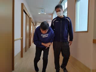 朝の活動です「いこい班」はBGMに合わせマッサージやウォーキングを中心に過ごしました