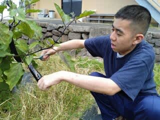 春に苗植えした夏野菜も大きくなりました今日は、なすびの収穫を行いました。