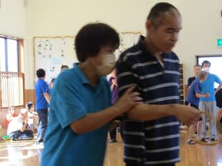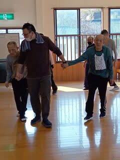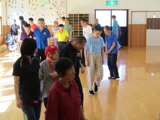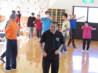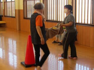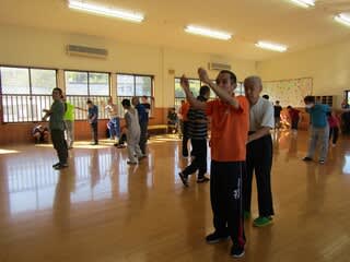 プレイルームにて、ラジオ体操と歩行訓練を行います。