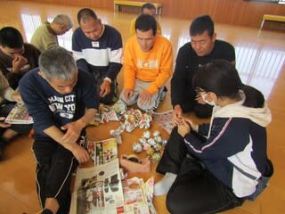 午前の活動では新聞と傘を使ったレクリエーション活動でしたまずは新聞を丸める作業をひたすらに・・・