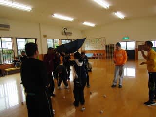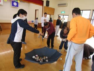 あっという間に沢山の玉が出来上がりましたその後、傘をカゴに見立てた「玉入れ」の開始です