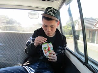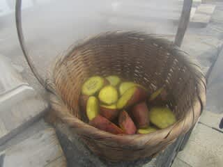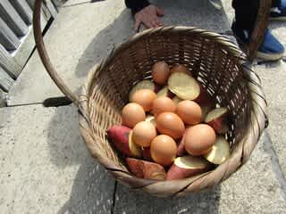 ジュース、お菓子、熱々のお芋、温泉卵を