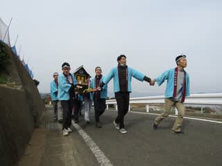 男子利用者さんにて御神輿をかつぎ、太鼓に合わせて、