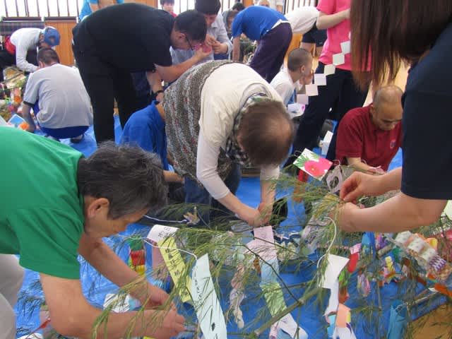 沢山の願い事の短冊 手作りの飾りで、笹竹は綺麗に彩られていきます