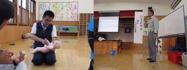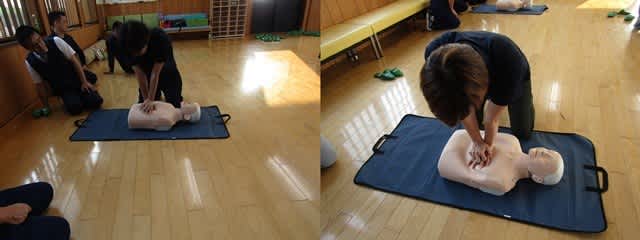 心臓マッサージや人工呼吸の仕方を教わり成人、乳幼児の対処法を知りました。