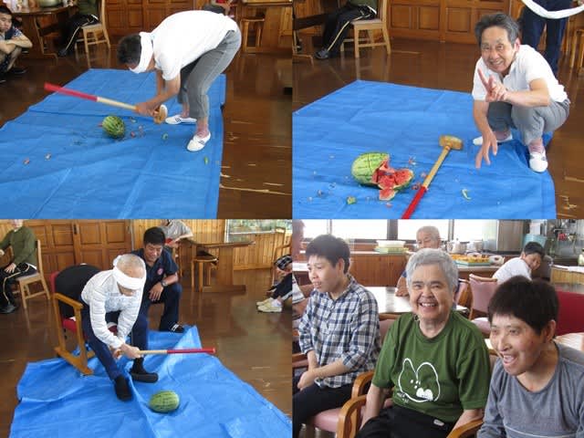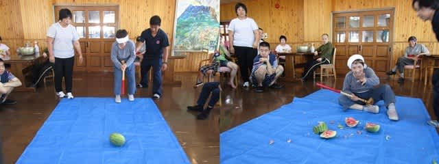 スイカが割れると、大満足の笑顔です大盛況のスイカ割り大会となりました