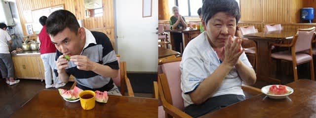 そして、戸外班の畑の茄子が沢山実りましたスイカ・茄子・トマトと沢山の野菜を提供してもらっていますありがたいですね