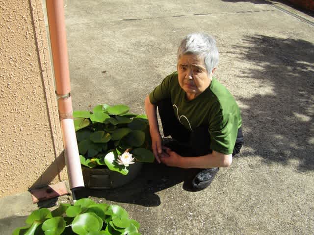 花が好きな利用者さんと一緒にパチリ(少し眩しそうです)