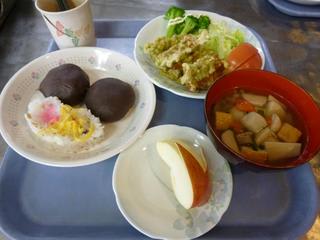 さて、今日の昼食のメニューは押し寿司、ぼた餅、ちくわの磯部揚げ、五目汁、牛乳、りんごです。