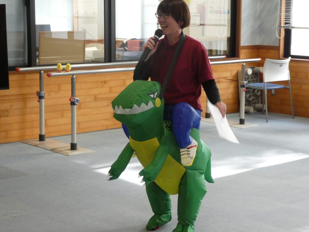 今回のゲスト司会者は・・・恐竜に跨ったミヤノ・レックスくんです!