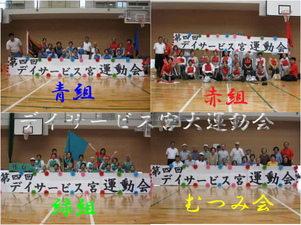 平成19年6月23日(土)デイサービス宮大運動会が開催されました。 今年度は宮利用者3チーム(赤・青・緑チーム)の他、上木場自治会むつみ会にも参加していただき4チーム対抗の大変熱気ある運動会となりました。