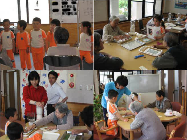 今日も朝から元気な園児達が来ました。あいさつも、とても上手にできましたよ。八幡保育園キリン組みの園児と利用者で紙スキ作業を行っています。 どんな作品ができるのか楽しみですね。 利用者方が子供達に優しく教えてくれたかな?
