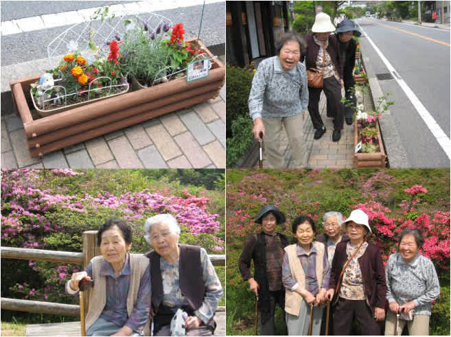 利用者の方々は子供大好きで、散歩で疲れた皆様に園児達が花を摘んできてくれています。かわいいですね。