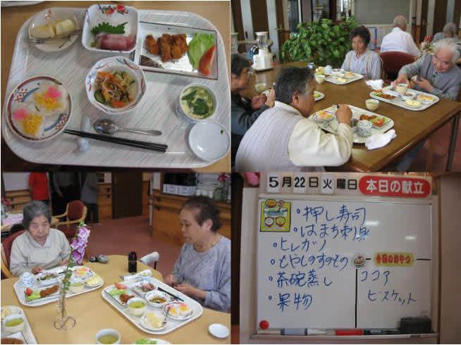 今日の昼食は「御馳走の日」で、刺身に御寿司にと、とても豪華で皆さん大変喜ばれました。「魚が新鮮でうまか」「食べきれんごてあるな」「今日は来て良かった」等声もきかれました。 美味しそうでしょう?