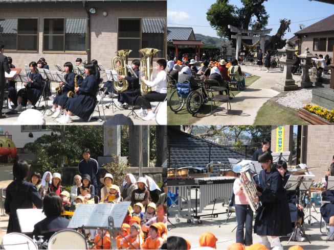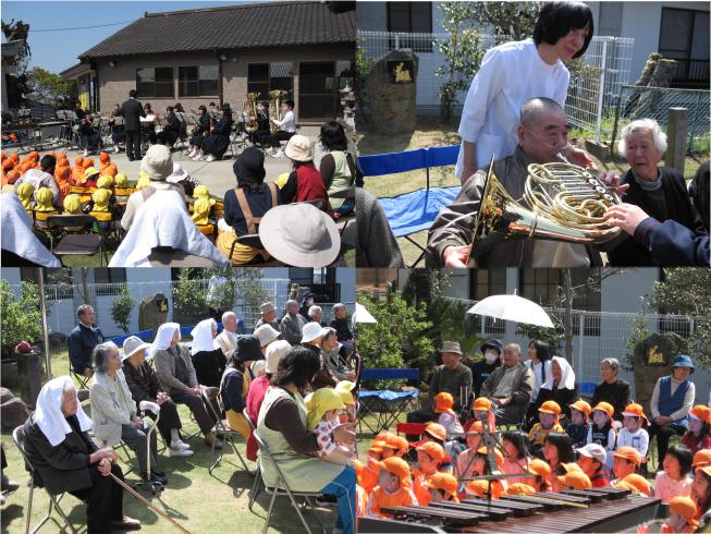 平成19年4月7日(AM10時)本日は雲仙市立南串中学校 吹奏楽部の中学生が八幡神社園庭にて楽器演奏をしてくれました。管楽器や打楽器の複数の楽器の合わさった音はさすがに良いものでした。 練習もしっかりされていて、とても上手に演奏され利用者方も感動されていた様子でした。 (管楽器)「フルート、トランペット、ホルン、チューバ、ユーフォニアム、トローンボーン、サックス等」・(打楽器)「スネアドラム、バスドラム、太鼓等」 1種類ずつ音を出し楽器紹介をされ実際に利用者や園児そして職員も試演奏しましたが管楽器はなかなか音が出ず難しいようでした。写真にも写っていますが、宮利用者の方もホルンに挑戦されかすかに音がでたと喜ばれていました。子供達には打楽器が大人気だったようです。春の暖かい日差しに照らされ綺麗な音楽を聴けて心がなごむ感じでした。南串中学吹奏楽部の皆さん本日は素晴しい演奏ありがとうございました。