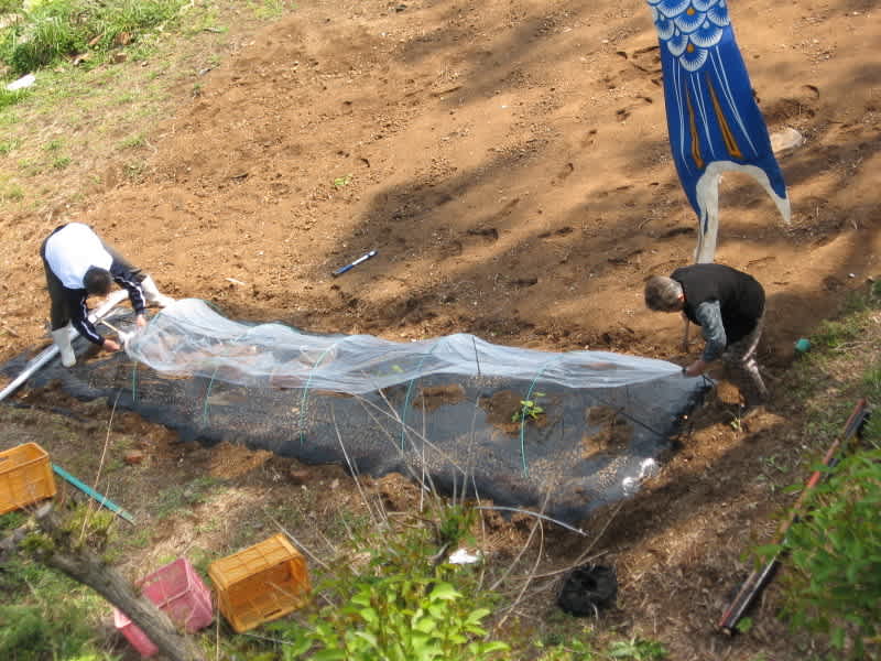 デイサービスの畑(となる予定)の場所に鯉幟が泳ぎました。 風にふかれて「そよそよ」皆さん大喜びでした。