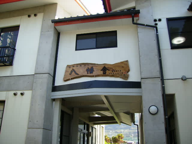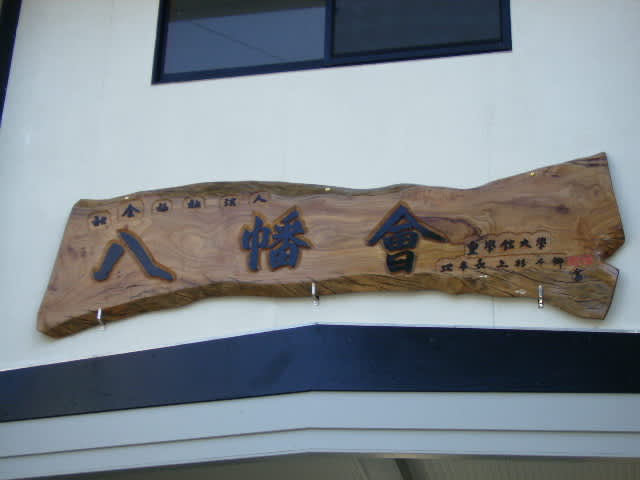 八幡会の木彫り看板が出来上がり、八幡会本部上の宮と杜の廊下外に設置されました。