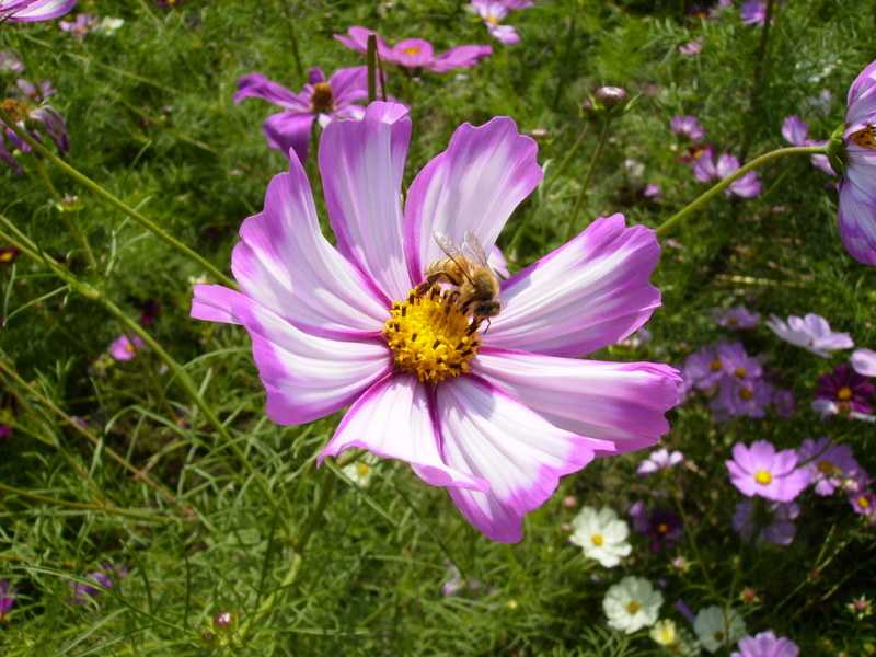 コスモスに蜜蜂がとまっているところをマクロ撮影しました。 (画像をクリックすると大きな画像になりますよ!)ご覧あれ!