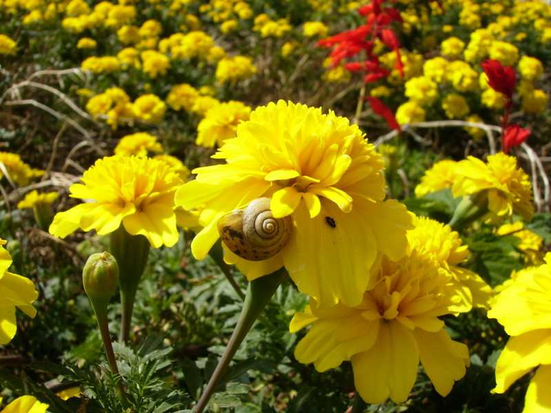 3回目のポップアップ写真はマリーゴールド(イエロー)にカタツムリがくっ付いていましたのでマクロ撮影してみました。(写真をクリックすると大きな画像になります)
