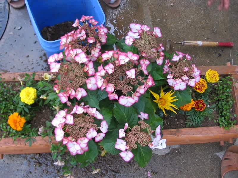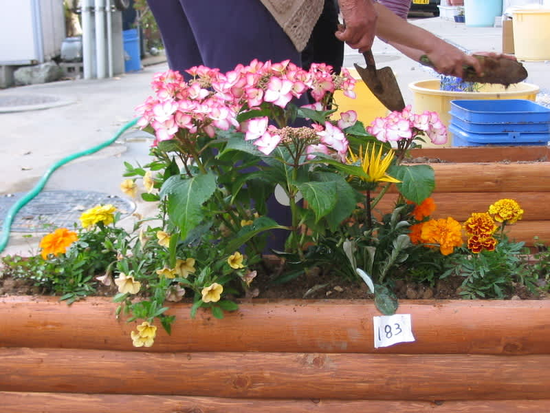 Frawa3 今年はどんな花にしようか? どんな形にしようか?迷いました。 花の苗を買いに行ったところ「あじさいの花」Hana1 を見つけました。あじさいの花を中心に飾ってみました、どうでしょうか? 今年こそは入賞をねらうぞ! オー(・Q・)/~~