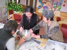 生活支援ハウス杜の横に咲いている、ハーブを移植させるため、ペッドボトルを使用して花瓶?鉢?をみんなで製作している場面です。最終的にどのような物ができるのか、楽しみですね。(5月1日)