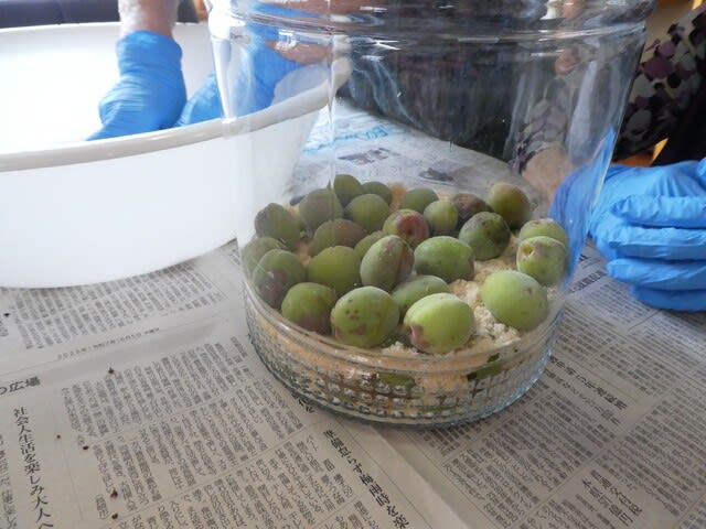 この梅を使って、まずはヘタを取りながら梅を綺麗にして、砂糖(三温糖)と一緒に瓶詰めをします