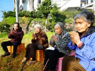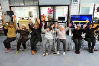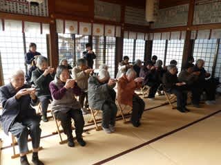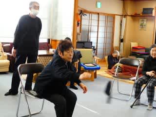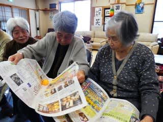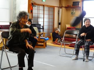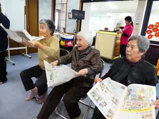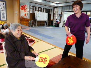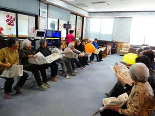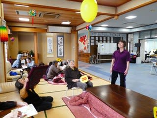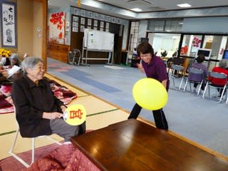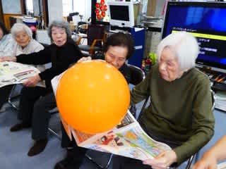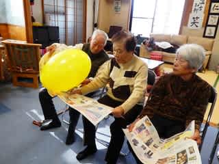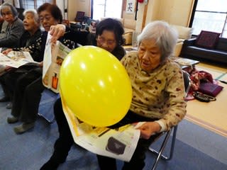 今週のレクリエーションは、新聞紙を広げて風船やピンポン玉を乗せ、隣の人に渡していく「一旦木綿ゲーム」です。