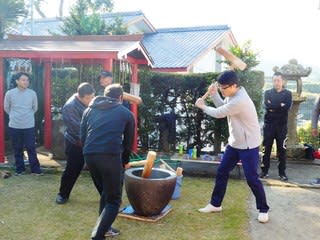 12月15日(土)は保育園と合同で餅つきがありました。お天気にも恵まれ、餅つきの始まりです