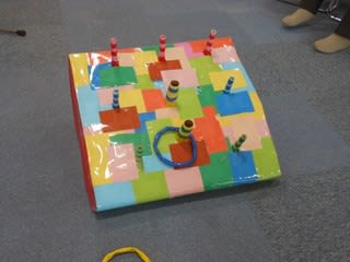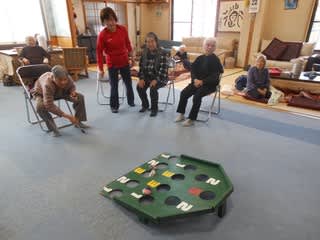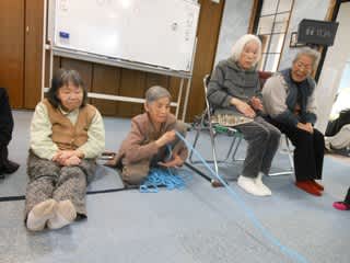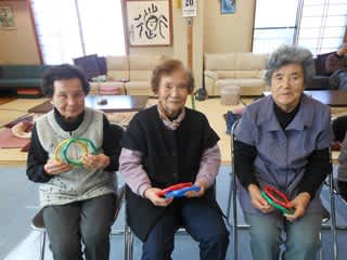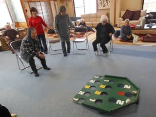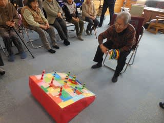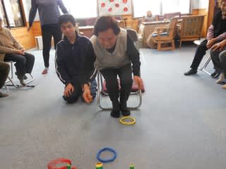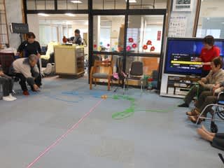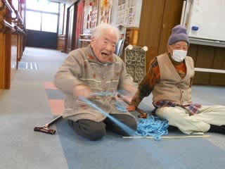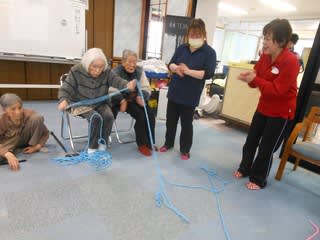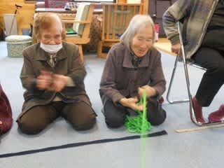 今週のレクレーションは毛糸玉糸引き合戦をおこなっています