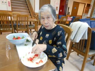 苺を切る方、材料を混ぜる方と、皆さんで分担し、ワイワイ賑やかにクッキングを楽しんでいらっしゃいました
