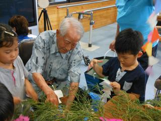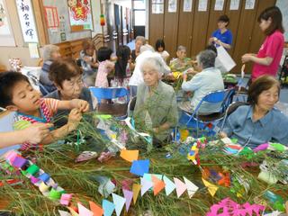 利用者さん、園児さん、それぞれに書いた願い事や、色とりどりの飾りを、仲よく付けていき・・・