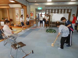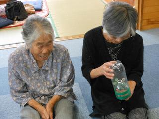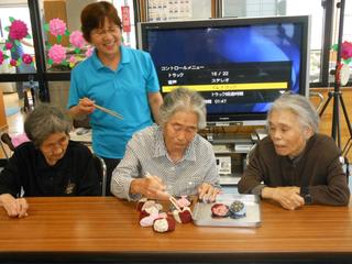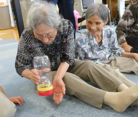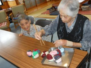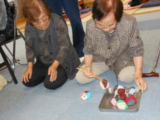 今週のレクレーションは、箸を使ってお手玉を皿に移し