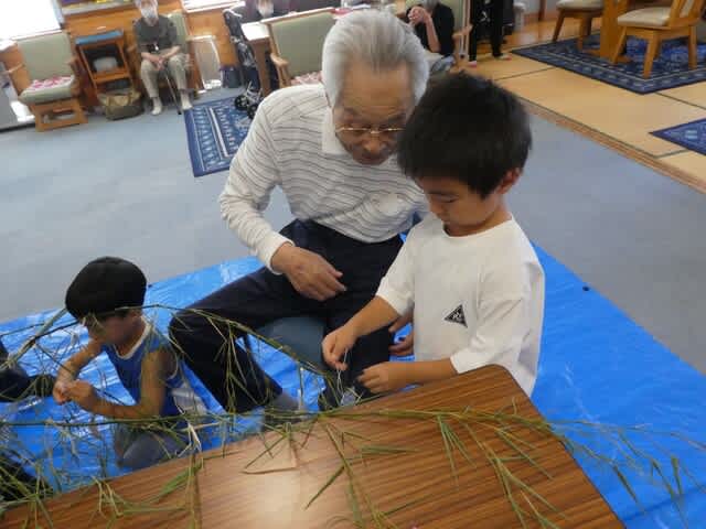 協力しながら、利用者さんが保育園児さんに笹への結び方を優しく教えます