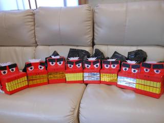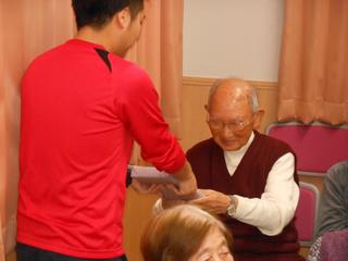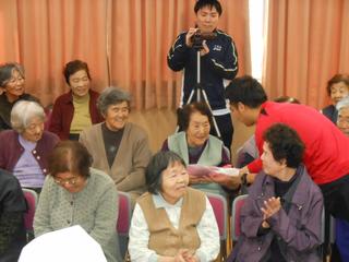 お遊戯を見せてくれた保育園児さんにお礼でお菓子の詰め合わせをプレゼントです