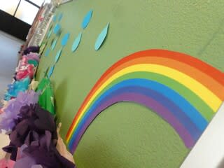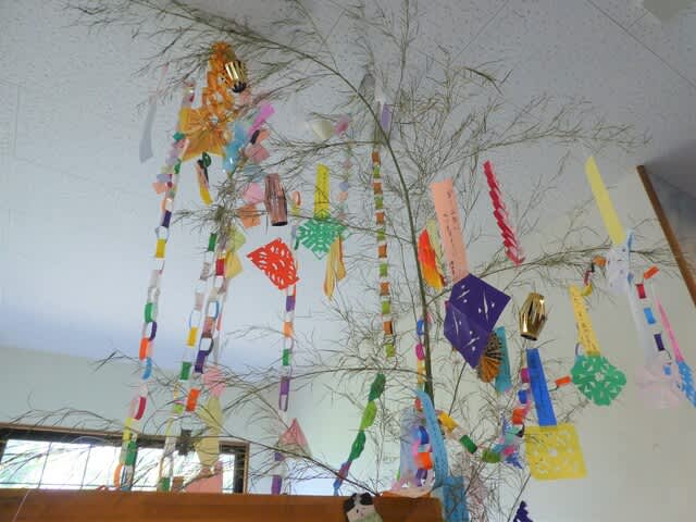 先日の飾り作りで作成した、綺麗な飾りと短冊をみんなで協力して笹に付けていきます