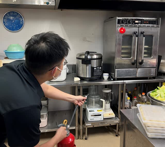 実際の火災を想定し、初期消火から通報・避難までを実施しました
