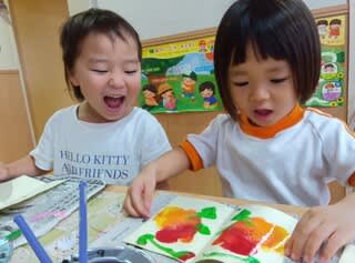 3歳児さんは、絵の具を使ってデカルコマニーを行いました。