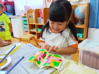 それぞれ好きな色の絵の具を画用紙にのせて、模様を作っていきます(^^♪