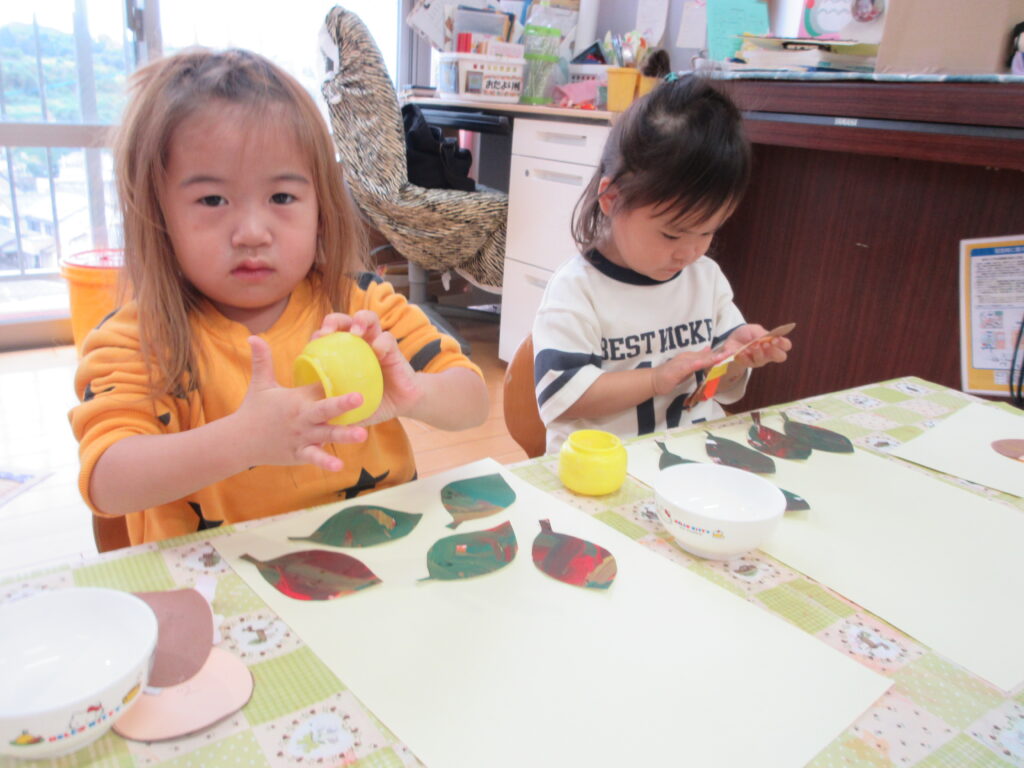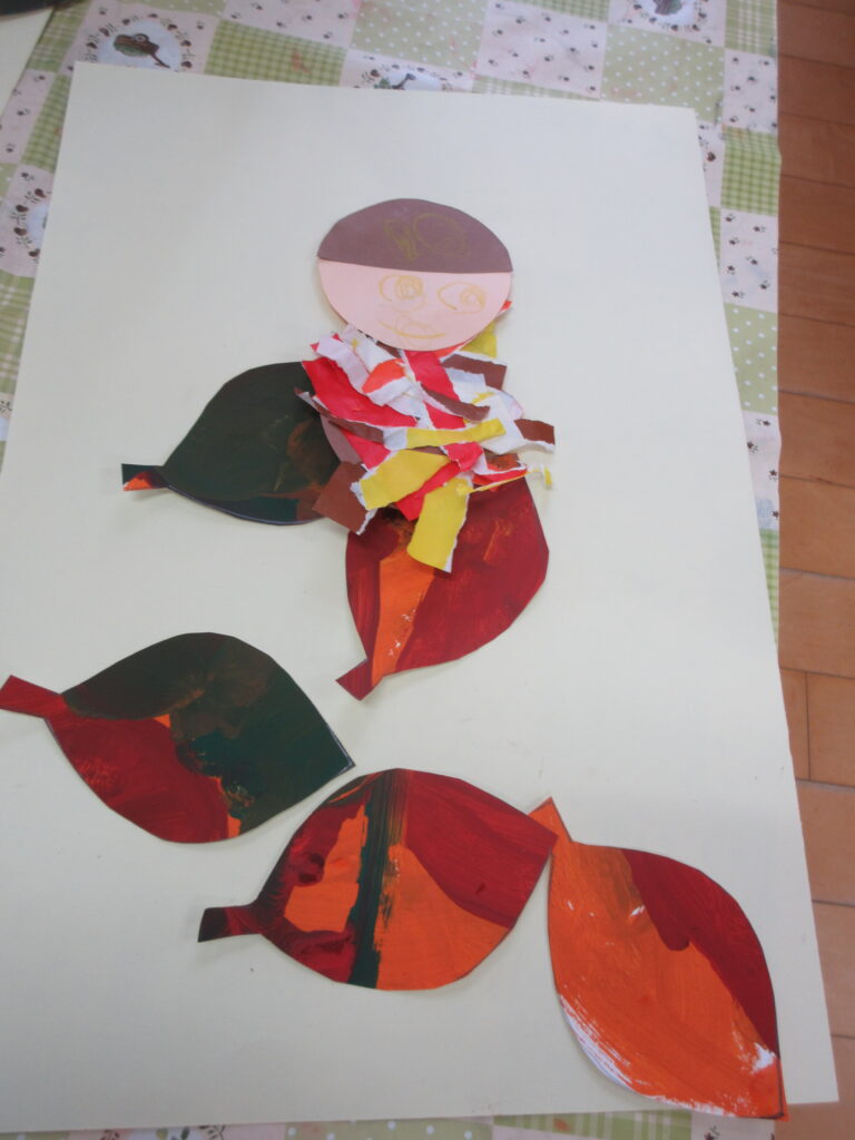 絵の具で枯れ葉を塗ったり、みのむしを折り紙で貼ったりと