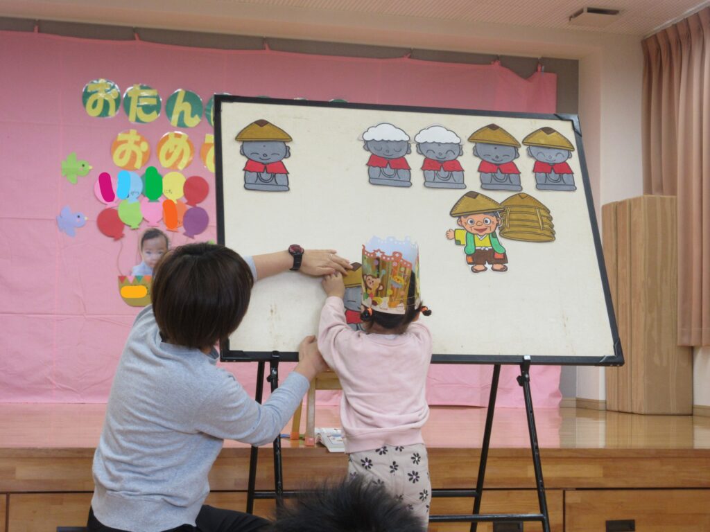 子どもたちが楽しみにしている保育士からの出し物は「かさじぞう」のペープサート。
