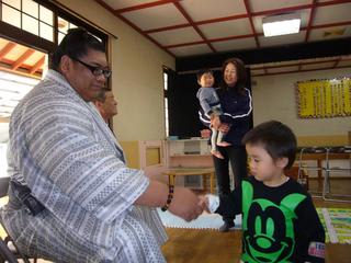 今日は、南島原市出身の佐田の富士関が、保育園に遊びに来られました。関取と握手をしてもらい、その手の大きさにビックリ❢最初は、恐る恐る握手してもらっていた子どもたちも、関取の時折見せるはにかんだ笑顔に和み、ほぼ全員握手してもらい満足していました