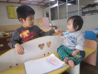 年末のホリデーの様子です。5歳児さんと0歳児さんの利用でしたが、5歳児さんがお絵かき帳を広げてると、ハイハイしながらやってきて、チョコンと座った0歳児さん。