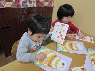 土台のケーキの絵に、いちごやクッキー・ろうそくなどのシールを思い思いに貼っていますよ