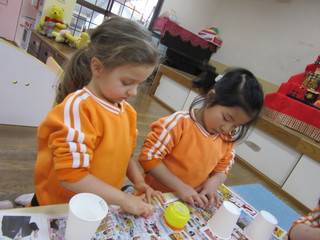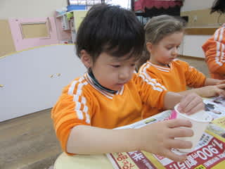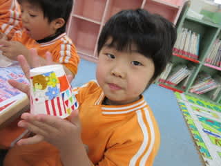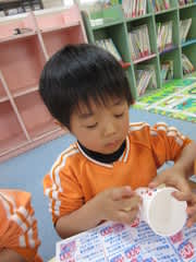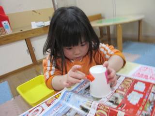 さて、今回は・・・?紙コップを片手に、色紙で糊付けをしていますね