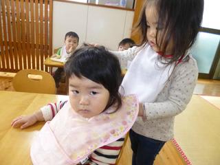 小さいクラスの様子です。2歳になった1歳児さんは、自分より下のお友だちのお世話を進んでしてくれます