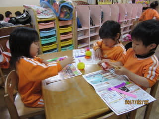 3歳児さんたちが、細く切った色紙に糊付けをしています。