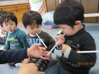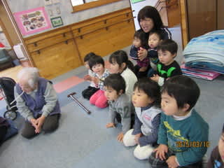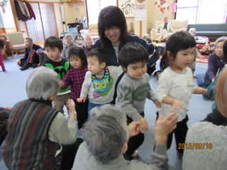 今日の午前中、2歳児さんと交流に来ていた1歳児さんとで、デイサービスへ遊びに行ってきました。