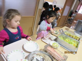 バイキングワゴンに乗ったメニューを、お皿に入れている3歳児さん❢