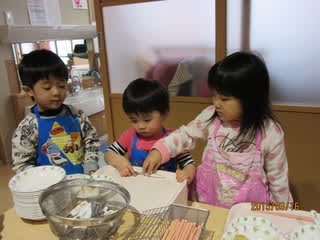 この日は2歳児さんが交流に来ていて、3歳児さんに優しく教えてもらっていました